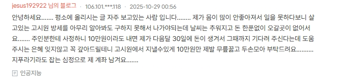 딱히 믿지도 않지만 갱신을 몇 달 동안 안 하는 경우가 허다한 내 블로그를 자주 본다면 내가 어떤 생각을 하고 있는지 알 거고 이런 글을 보고 멍청하게 어이구 불쌍해 뉘신지 모르겠지만 입금해 드릴게요라고 할지 씨팔 왜 이딴 새끼나 꼬이는 거야라고 할지 알 수 있을 텐데 어쩌라는 건가 싶다. 일을 못해서 방세를 못 내고 있는 상황인데 신기하게도 다음달 말에는 돈이 생긴다니 참 재밌는 지갑사정이네. 그 돈을 당장 생기게 할 수는 없는 건가? 결국 내가 누구인 줄 알고 은혜를 갚는다는 걸까. 방세도 못 낸다는 사람이 어떻게 갚는다는 거야. 이런 글 쓸 여유는 어디에서 나오는 걸까? 돈이 십만 원도 없다면 핸드폰도 못할 거고 그럼 내 블로그 볼 수 있는 방법도 없을 텐데. 십만 원도 없으면 생활도 못하지 않나? 이딴 사기나 칠 힘으로 한강물 더 차가워지기 전에 입수하세요. 入水입니다 다른 뜻으로 생각하고 계속 추하게 살아있을 것 같아서 친절하게 한자까지 달았습니다.